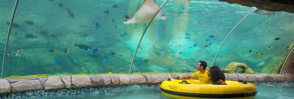 The tubing adventure begins with a leisurely float along a lazy river, where you'll be surrounded by tropical landscaping and soothing waterfalls. But the real adventure begins when you enter the aquarium section of the ride.