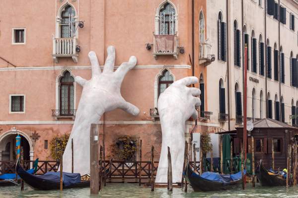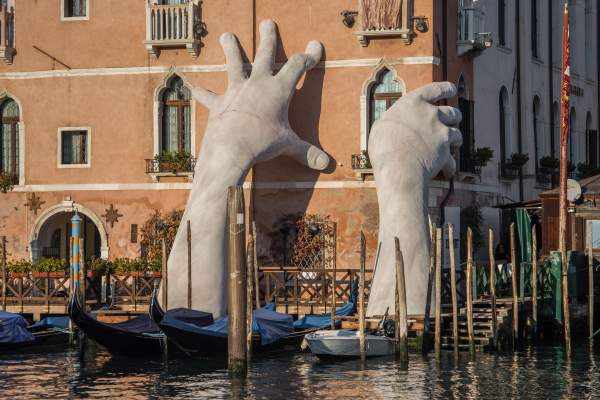 As one gazes upon this striking tableau, an awe-inspiring symbolism takes shape, for these colossal hands appear as if conjured from the depths of human imagination to fulfill an improbable role—cradling the timeworn walls of the historic hotel, seemingly poised to prevent it from succumbing to the inexorable embrace of the encroaching waters. In this visual masterpiece, we find a profound metaphor for the dual forces at play: the imminent menace of climate change threatening to submerge the Floating City beneath the relentless Mediterranean tides, and the enduring resilience of humankind's indomitable spirit to combat this impending catastrophe.