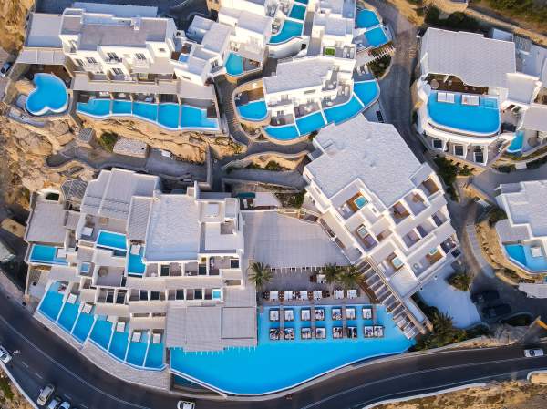 Myconian Utopia Resort: Standing atop a cliff, the Myconian Utopia Resort combines natural beauty with luxurious design. The spectacular view of Elia beach from the infinity pool is a sight to behold. Book Now.