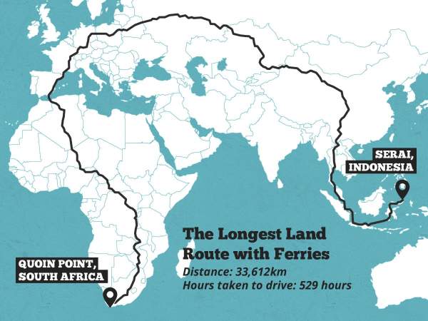 The longest road trip covers a distance of 33,612 kilometers. Starting just to the right of the Indian Ocean in Serai, Indonesia this long voyage includes ferries, travels along to Malaysia, north through China, west across Asia and Russia where it meets Europe at Belarus. From here the route carries on west through Europe to Spain, and south through Africa, reaching its final destination of Quoin Point, South Africa. Without stopping, not even for sleep or to check a map, something impossible and of course, not recommended, you would need 22 days to finish the route.