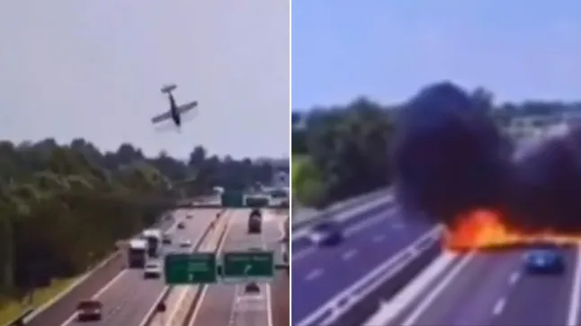A small aircraft crashed onto a busy stretch of the A21 motorway in Italy’s Brescia province around noon today, bursting into a massive f...